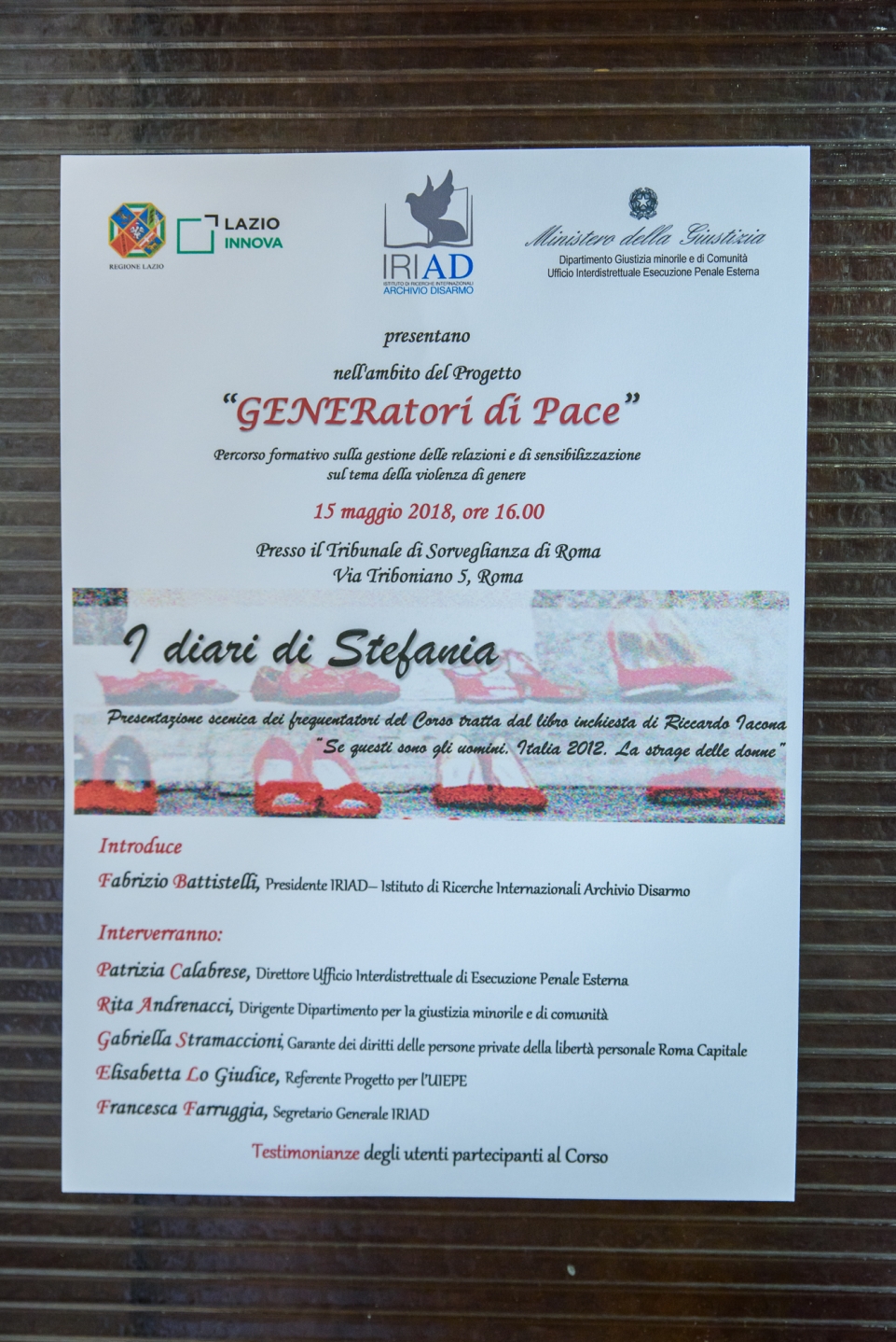 Si è tenuto il 15 maggio 2018 l'evento conclusivo del progetto GENERatori di pace presso la Sala del Tribunale di Sorveglianza di Roma. Sono intervenuti RITA ANDRENACCI (Dirigente Dipartimento per la giustizia minorile e di comunità), FABRIZIO BATTISTELLI (Presidente IRIAD), PATRIZIA CALABRESE (Direttore UIEPE), FRANCESCA FARRUGGIA (segretario generale IRIAD); ELISABETTA LO GIUDICE (referente progetto UIEPE); GABRIELLA STRAMACCIONI (Garante dei diritti delle persone private della libertà di Roma Capitale).