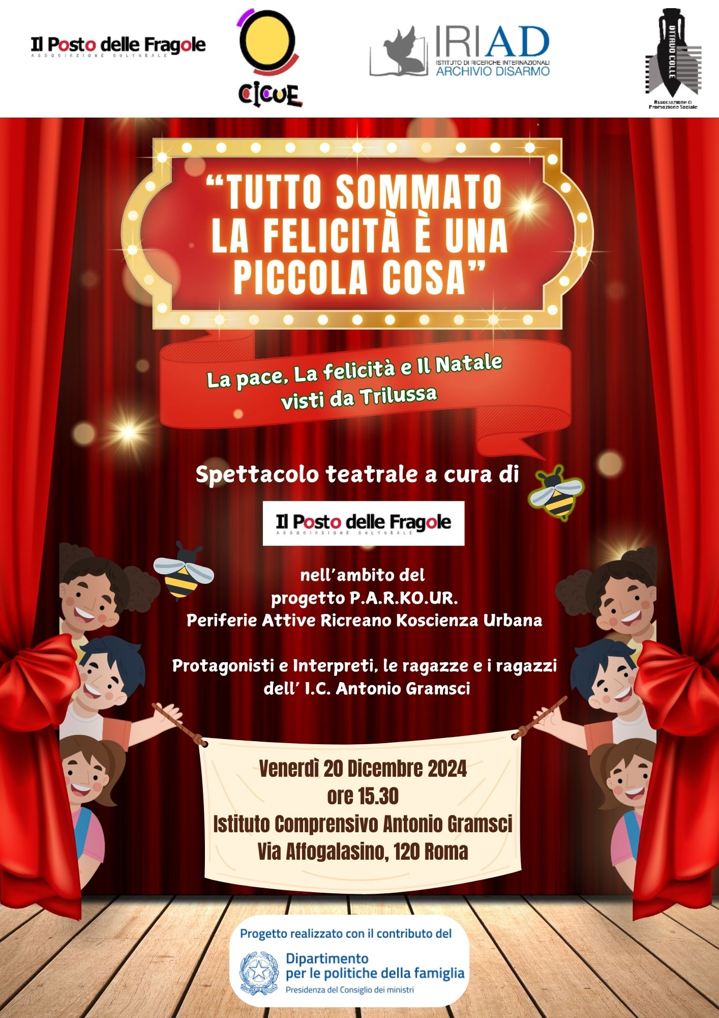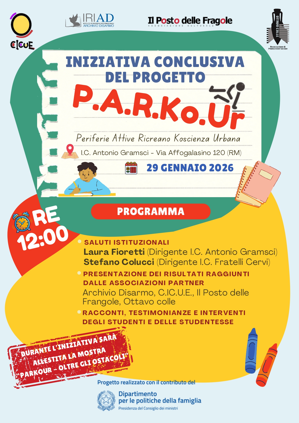 P.A.R.KO.U.R. è un progetto promosso da IRIAD – Archivio Disarmo, in partenariato con CICUE, Ottavo Colle APS e Il Posto delle Fragole, con l’adesione dell’IC Antonio Gramsci e dell’IC Fratelli Cervi di Roma.